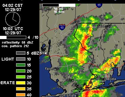radararthurbrown.jpgA heavy rain shower with lightning was over the North Escambia area at the time. This radar picture shows a heavy shower at 4:02 a.m. over the Walnut Hill and Enon areas. It was moving easterly at about 30 mph.