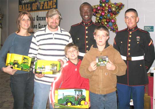 EscaRosa Young Farmers and Ranchers, a non-profit organization comprised of agricultural producers from Escambia and Santa Rosa counties, chose toys for Tots for their 2008 charity. The EscaRosa YF&Rs collected farm-related toys to donate to the annual Toys for Tots drive. Pictured re EscaRosa YF&R chairman, Ben Ellison, and his wife Jamie and their two sons, Tristan and Bailey, with local Marines at the Pensacola Civic Center recently. Submitted photo.