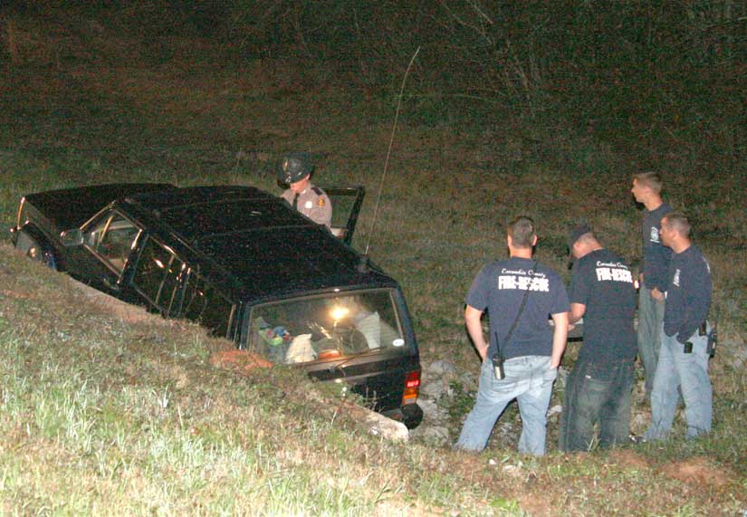A Jeep Cherokee was in a culvert in a wooded stretch of Highway 97 near 4690 Highway 97.