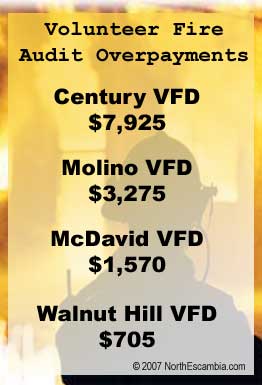 The audit find thats volunteer firefighters were overpaid $39,500 during the six months from October 2006 to February 2007, with one third of that money going to firefighters in North Escambia. An audit conducted by the volunteer fire departments found $24,575 in overpayments county-wide.