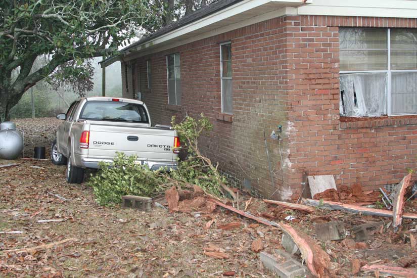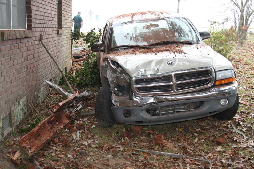 A Dodge pickup truck driven by Henry Edward Myrick of Sunshine Hill Road, Molino collided with a house at the intersection of Highway 97 and County Road 99 in Walnut Hill Saturday morning. There were no injuries.