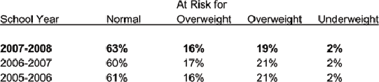 BMI is a measurement of body fat based on height and weight and is used to screen for ealth problems resulting from an unhealthy body weight. The BMI for 19 percent of Escambia County students came in as “overweight”, with another 16% “at risk for overweight”.