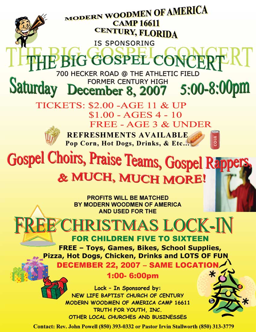 “The Big Gospel Concert” will be held Saturday night from 5:00 until 8:00 at the athletic field at the old Century High School. The event will feature gospel choirs, praise teams, gospel rappers and more. Refreshments including popcorn, hot dogs and drinks will also be available.