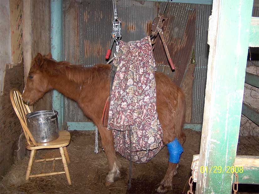 “The owner thought she was helping the colt by getting it off of an injured leg. She failed to get proper medical care, so the colt was left alone the majority of the day and all night, hoisted up by ‘come-alongs’ without access to food and water,” said PER President Diane Lowery.
