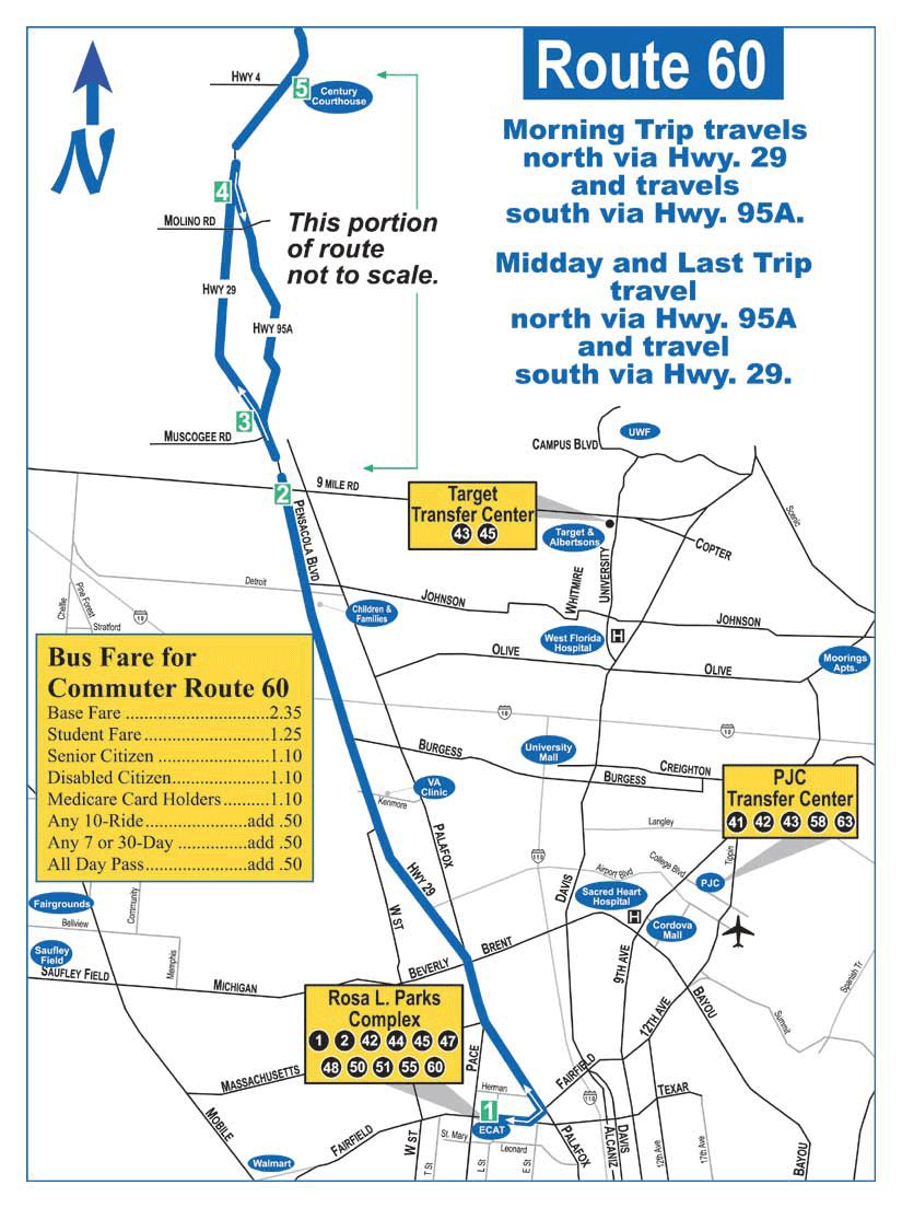 Southbound, the new midday bus on Route 60 begins Monday through Friday at the Century Courthouse at 12:35. It then stops at Highway 29 and Highway 95A in Molino at 12:47, Highway 29 and Highway 95A in Cantonment at 12:56, Highway 29 and 9 Mile Road at 1:05 and ends at the ECAT transfer center at 1:25.