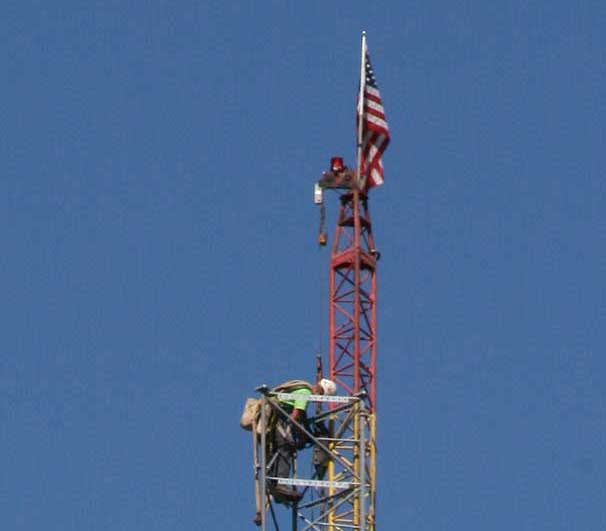 A large American flag was gently waving in the wind at the top of the construction mast above the tower as it was being constructed.