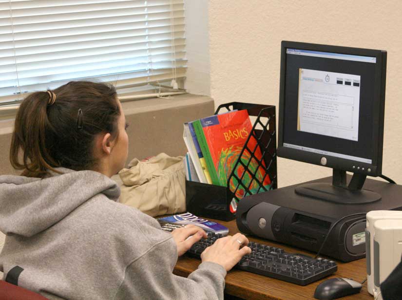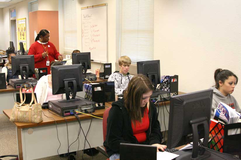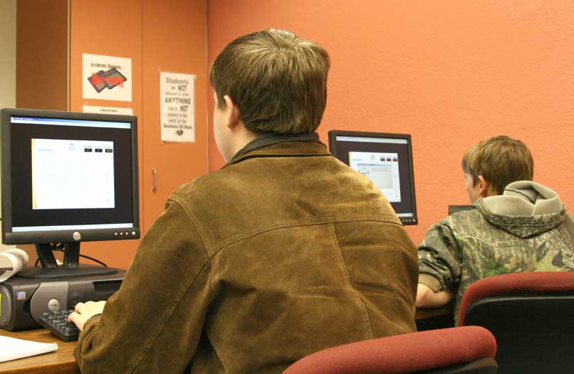 Pictured above: Eric Ickeringill and Mark Shipps take the timed typing test Thursday morning at Northview. Below: Raven Knapp (left photo) and Alisha Copeland (middle photo) participate in the keyboard race. Right photo: Students in Mrs. Annie Gilmore’s first period class participated in the FBLA week timed typing race. Click any photo to enlarge. NorthEscambia.com photos.