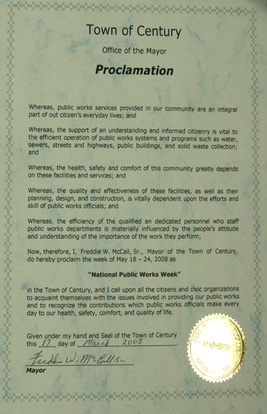 The Town of Century has proclaimed the week of May 18-24 as “National Public Works Week” in the town.