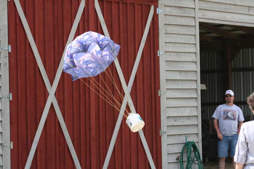 The annual event included an Easter Egg Hunt, food, fishing, a puppet show and even an Egg Drop. In the Egg Drop, children created containers they thought could be dropped from the loft of a barn to the ground with an egg inside…without breaking the egg. Four children were successful in creating such containers, including one design that included a parachute (pictured below).