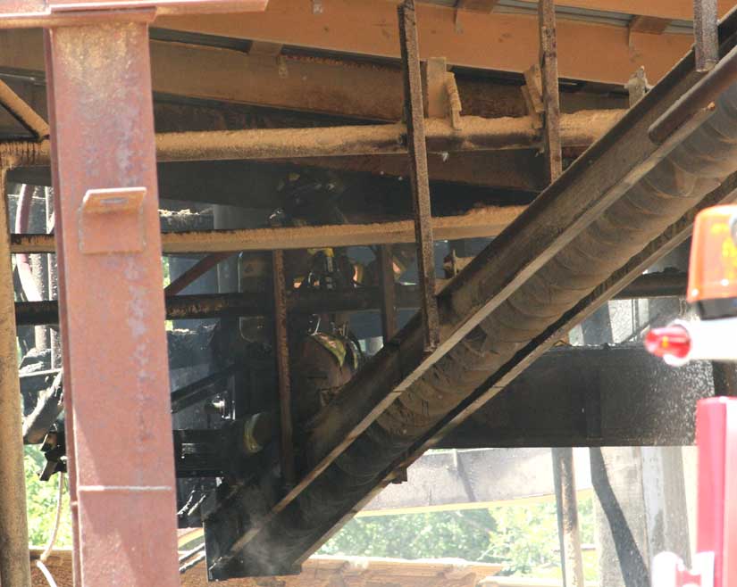 Pictured above: Fire explodes from the back of a wood chip trailer when it is opened at Bondurant Lumber in Flomaton Wednesday afternoon. Pictured below: A fireman works in the rafters of a building at the lumber company. NorthEscambia.com exclusive photos, click to enlarge.