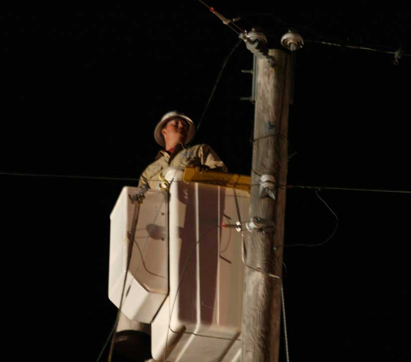 Pictured above and below: The driver of this Pontiac Grand Am was not seriously injured in a Sunday night crash that left many along Highway 97 without power. Pictured bottom: An EREC crew member works to restore power Sunday night. NorthEscambia.com exclusive photos, click to enlarge.