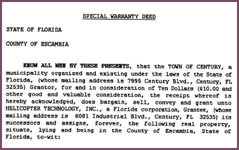 According to documents obtained by NorthEscambia.com, the property was sold by the Town of Century on January 19, 2001, for the sum of $10 “and other good and valuable consideration” to Helicopter Technologies, Inc. It was signed by then-mayor Benny Barnes.