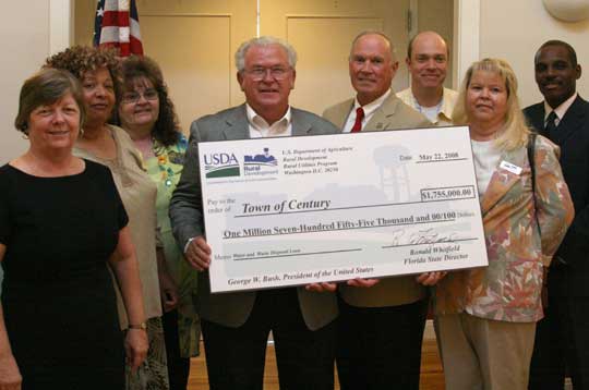 Pictured below: USDA Rural Development State Director Ronald Whitfield presents a ceremonial $1,755,000 check to Century Mayor Freddie McCall.