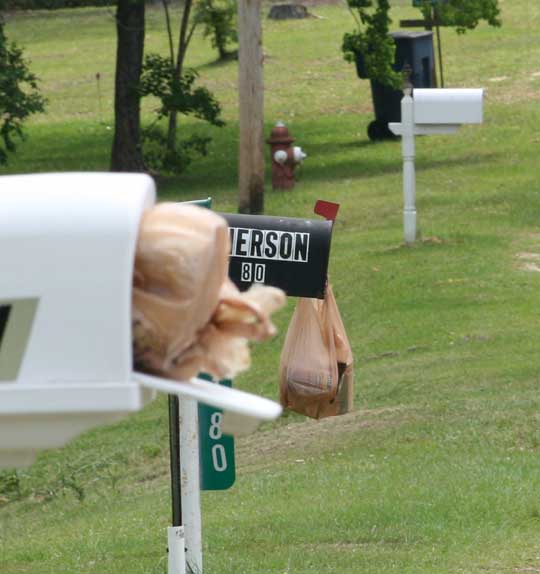 Pictured above: Food awaits collection in the Stamp Out Hunger food drive Saturday on Wiggins Lake Road in Walnut Hill.