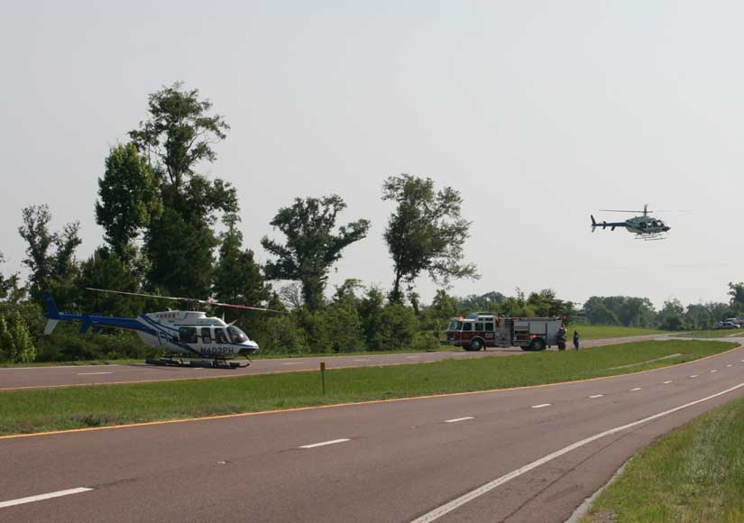 Pictured above: Two people were critically injured in this SUV Monday morning near Bluff Springs. Pictured below: The white pickup that collided with the SUV at Bluff Springs Road and Highway 29. Pictured below: One LifeFlight helicopter sits on Highway 29 as one lifts off with an accident victim. NorthEscambia.com exclusive photos, click to enlarge.