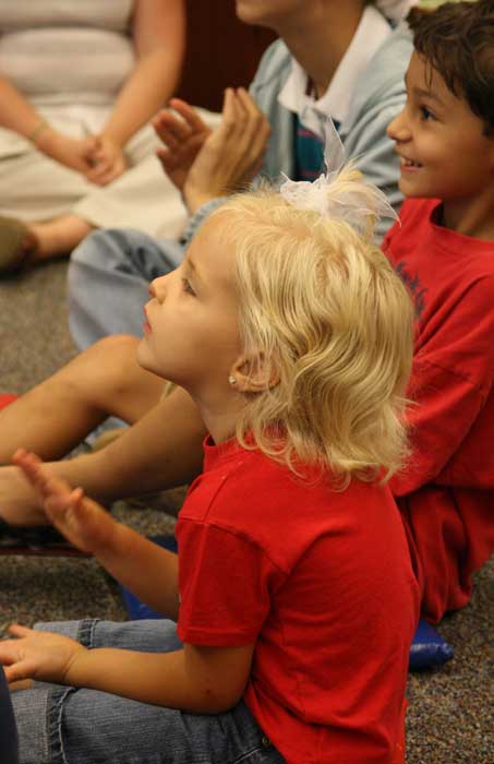 Pictured above: Magician Sammy Smith performs at the Century Branch Library Tuesday with a little help for an audience member. Pictured below: Children clap for a magic trick. NorthEscambia.com photos, click to enlarge.
