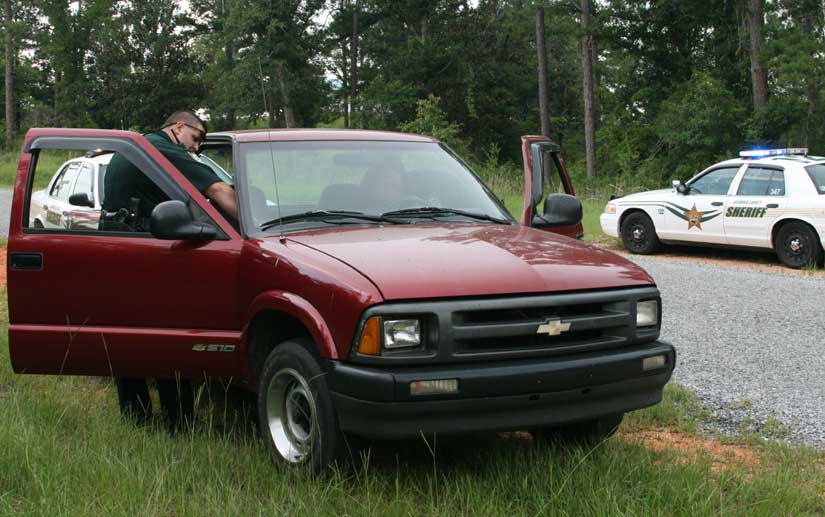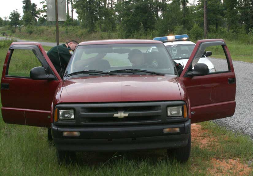 Pictured top: Deputy David Bashore places Payne into the back of sheriff’ cruiser. Pictured below: Deputies Ellis Smallwood (left) and Chris Knotts (inside the driver’s door) search Payne’s Chevrolet S10. NorthEscambia.com exclusive photos, click to enlarge.Pictured left: Payne’s jail booking photo.