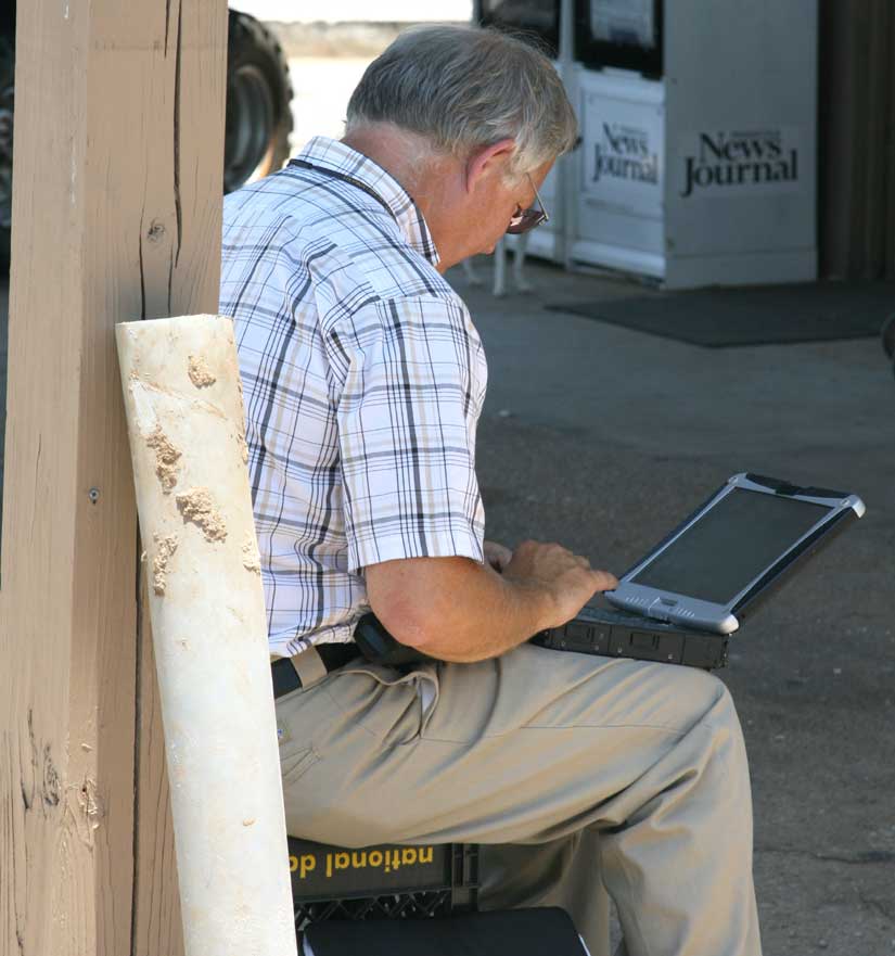 Pictured above: The gas tanks and pumps have been removed at Cooper’s Store in Bratt. Pictured below: A state inspector outside the store tracks the progress of the tank removal project Thursday afternoon on his laptop. NorthEscambia.com photos, click to enlarge.