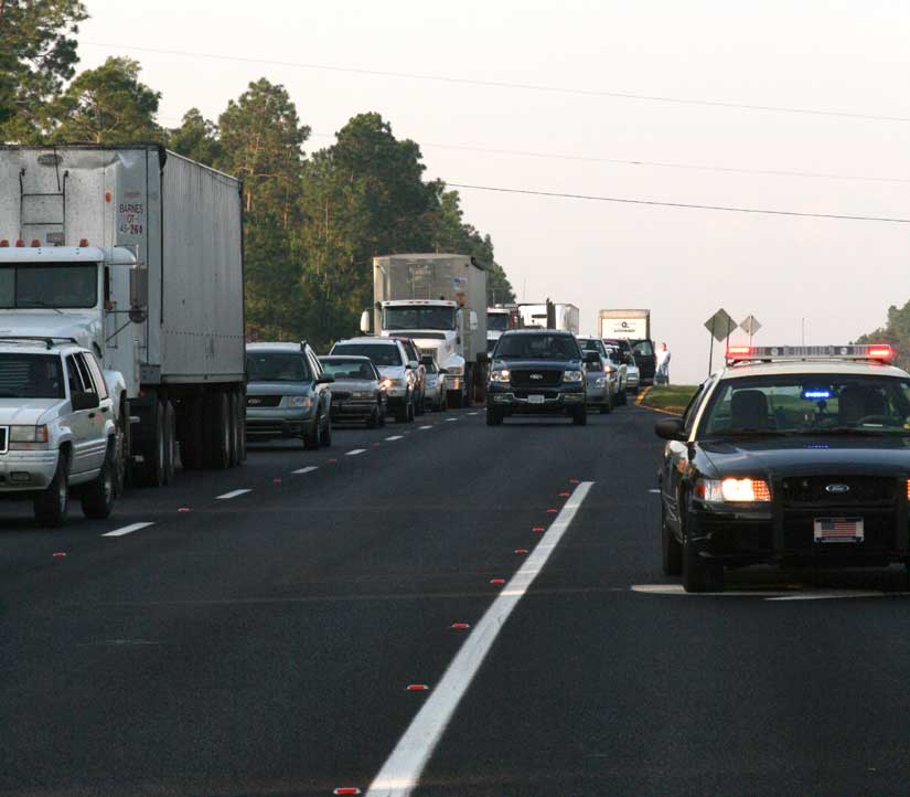 Pictured above: The driver of this vehicle was take by LifeFlight to Sacred Heart Hospital following an accident in Molino Tuesday morning. Pictured below: The pickup truck that struck the white car. Pictured below, middle: Troopers investigate the crash. Pictured bottom: Northbound traffic was backed up several miles. NorthEscambia.com exclusive photos, click to enlarge.