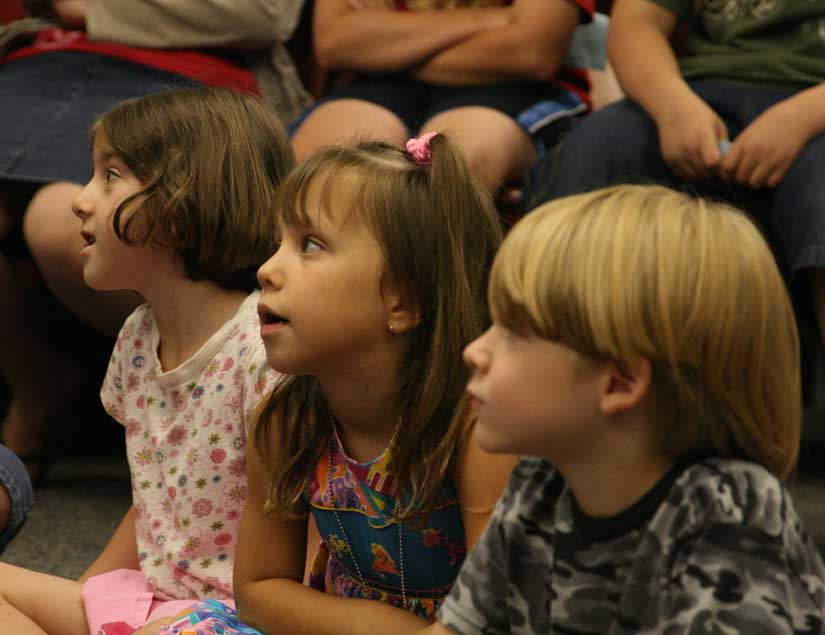 Pictured above: Characters Isaac Newton, Marie Curie and Charles Darwin from “A Short History of Nearly Everything” at the Century Branch Library. Pictured below: Children enjoy the program. NorthEscambia.com photos, click to enlarge.