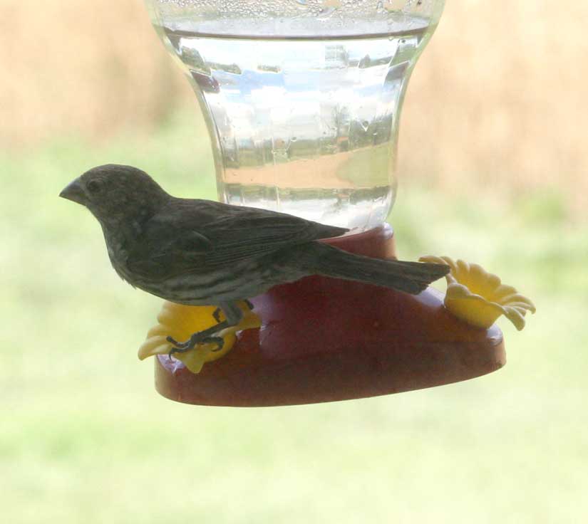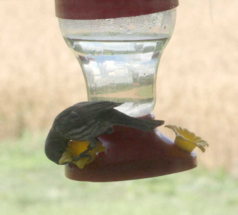 It is a female house finch. They will rob hummingbird feeders fairly regularly.