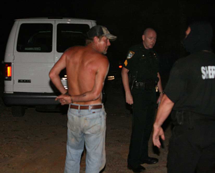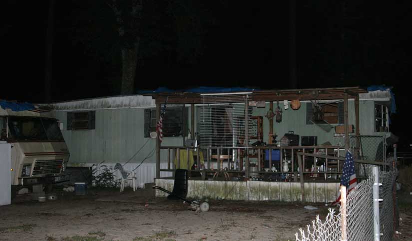 Pictured above: Billy G. Griffis, 51, is taken into custody before being transported to the Escambia County Jail about 3:30 Frudat morning on McCall Road. Pictured below: One of the raids was conducted at this mobile home and travel trailer on McCall Road near the intersection of Hudson Hill Road. NorthEscambia.com exclusive photos, click to enlarge.