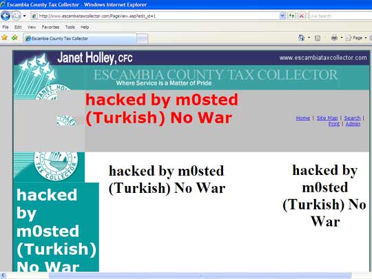 The Escambia tax collector’s web site was defaced by a hacker on Saturday, and now the site is down.