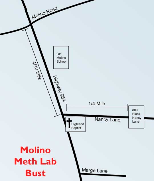 It took deputies and a hazardous materials team about 15 hours in to cleanup the methamphetamine lab in the 800 block of Nancy Lane off Highway 95A, about a quarter mile behind Highland Baptist Church. (A map is at the bottom of this story.)