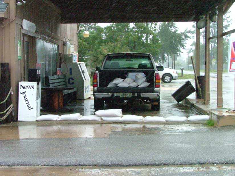 Pictured above: Sandbags were placed at Cooper’s Grocery in Bratt Saturday afternoon in anticipation of heavy rains to come and water running off Highway 4.