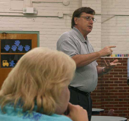 Pictured above: Carver/Century staffer Judy Bakers listens to Principal Jeff Garthwaite at a Thursday night meeting at the school. NorthEscambia.com photo.