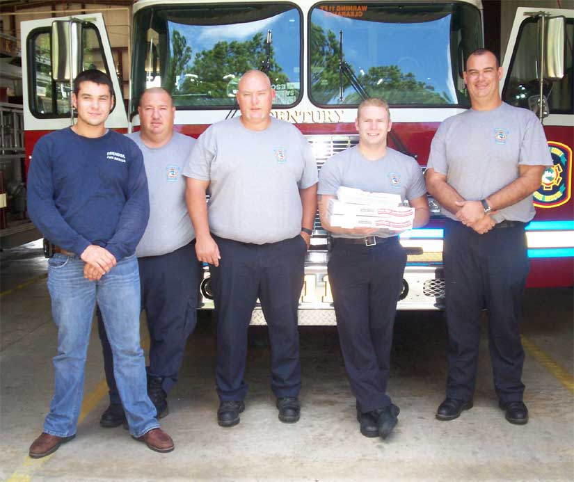 The crew on duty Thursday at the Century Volunteer Fire Department was treated to a pizza lunch on Patriot’s Day to honor them for their service. Pictured (L-R) are Nathan Berry, Lt. Greg Sims, Greg Therrell, Donald Merritt and Kyle Kraatz. The lunch was provided by an group of Century area citizens that wished to remain anonymous. Submitted photo for NorthEscambia.com, click to enlarge.