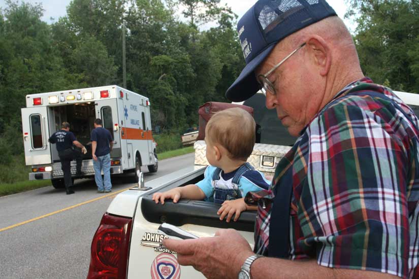 Pictured top: Retired Walnut Hill Volunteer Fire Department Chief Robert Stewart and his grandson Drew (“Little Man”) Kennedy watch from the sidelines at a recent accident on Pine Barren Road. Pictured above: Stewart at last year’s Walnut Hill Volunteer Fire Department fish fry. Pictured below: Stewart makes a call as “Little Man” watches an ambulance crew work. NorthEscambia.com photos, click to enlarge.