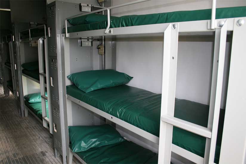 EREC has five trailers which will sleep 33 people each. In addition, they have a shower trailer with 10 showers and sinks. The sleeper trailers have central heat and air, as well as individual lockers for each occupant. Each bunk has overhead lighting and electrical outlets for cell phone charging. The bottom row of bunks has nighttime floor lighting as well.