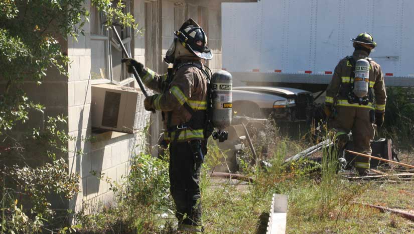 Pictured above: Firefighters work at the scene of a fire on Highway 4A in the Gandyville community Friday afternoon. Pictured below: A firefighter with an axe (left) begins to work to vent the roof of the building. NorthEscambia.com photos, click to enlarge.