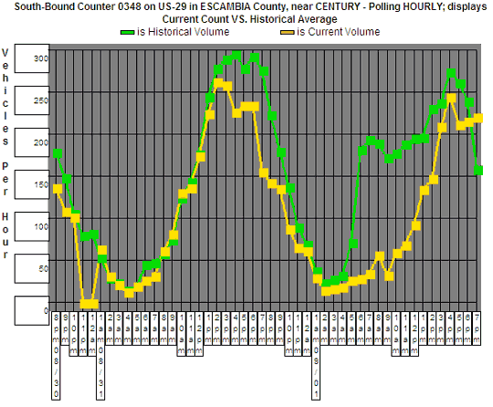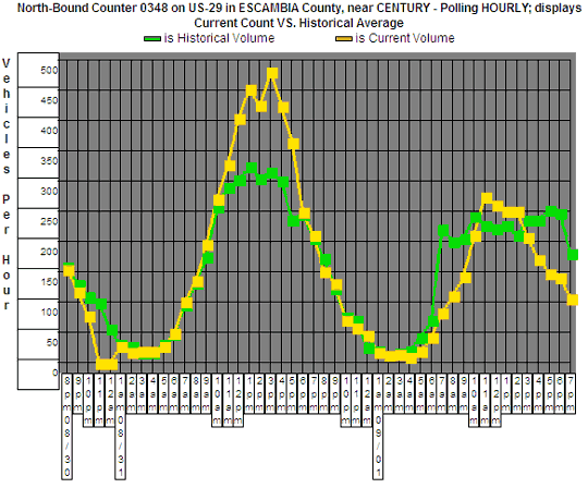 There is one live traffic counter in North Escambia located on Highway 29 just south of Century. It records and reports hourly data on traffic patterns, including vehicle counts and the average speed at the location.