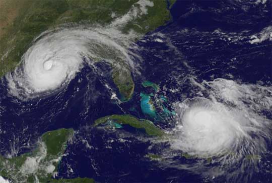 Pictured above: A satellite image showing Gustav making landfall in Louisiana (left) and Hurricane Hanna over the southern Bahamas (right).