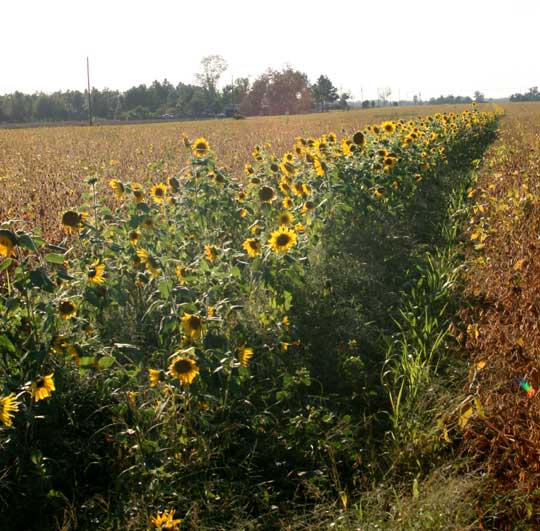 The rows of sunflowers, if placed end to end, would stretch about a mile. They are located in a soybean field in the Oak Grove community. The field is bordered by North Highway 99, Highway 164 and Melvin Road, making it possible to drive all the way around the field. The closeup sunflower photos here were taking along the Highway 164 end of the field Wednesday afternoon.