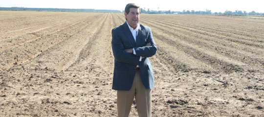 Pictured top: Alabama Governor Bob Riley at a sugarcane field in Atmore Tuesday morning. Pictured left: Riley will the first official Alabama sugarcane sprout that could one day become jet fuel. NorthEscambia.com photos, click to enlarge.