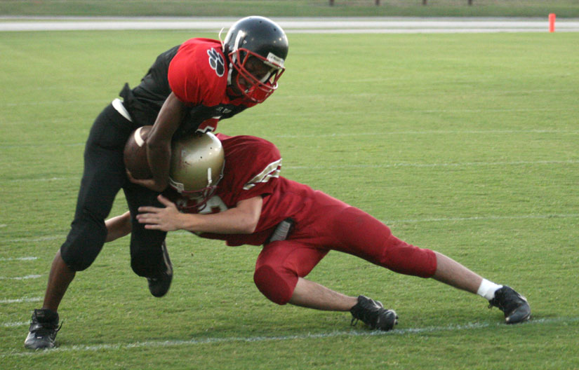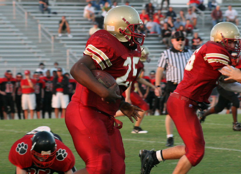 Pictured above: A Northview defender takes down a Catholic player early in the first quarter. Pictured below: Freshman Sean Knight picks up yardage for the Chiefs. NorthEscambia.com photos, click to enlarge.