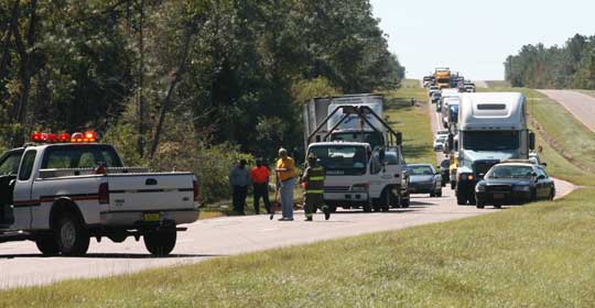Pictured above: The new caution light on Highway 29 looking south toward Byrneville Road.. Pictured below: The accident at the intersection that claimed the life of a Pensacola woman on June 23. NorthEscambia.com photos.