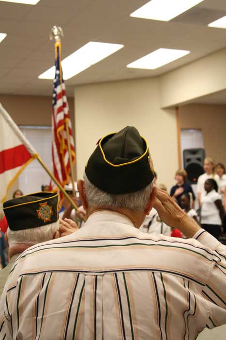 Pictured above: A veteran salutes the American Flag Friday morning during the annual Veterans Program at Bratt Elementary School. Pictured below: Some of the fifth grade students that participated in the program. NorthEscambia.com photos, click to enlarge.