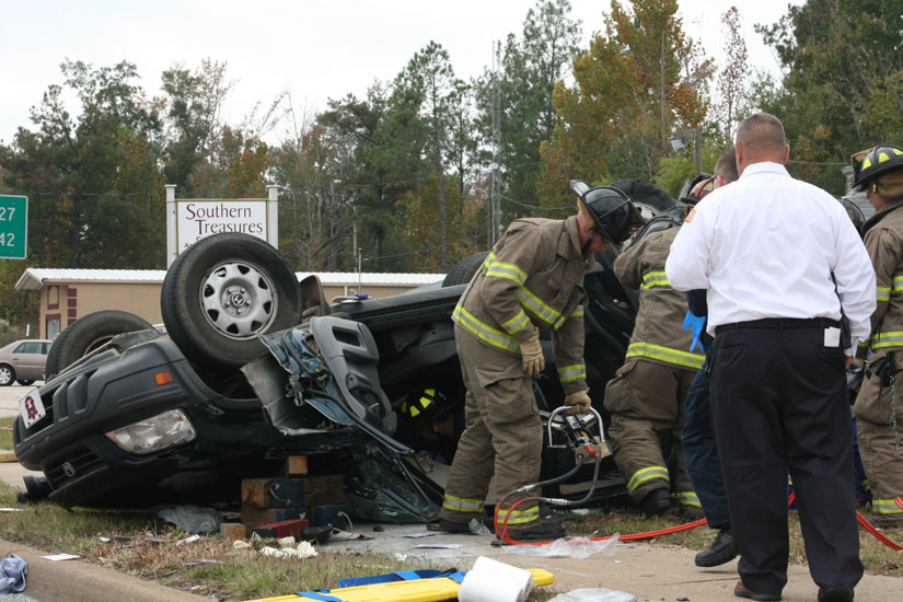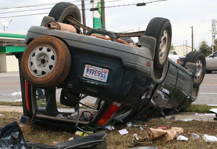 A pickup truck collided with a Honda CRV, causing the Honda to overturn near Southern Treasures. The vehicle landed on its roof just off North Century Boulevard. The two people in the Honda were injured, with it taking about 20 minutes to free the driver of the vehicle with the Jaws of Life.