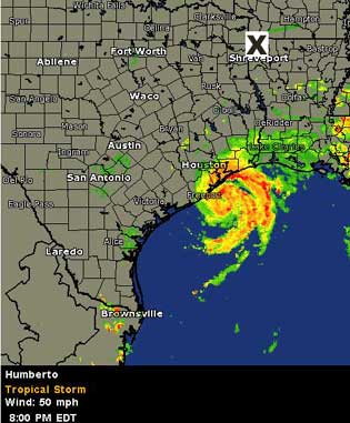 Radar archives from the National Weather Service indicate that the rain bands from Humberto had not approached the Hosston area at the time of the crash. The radar image to the right shows the rain from Humberto about 30 minutes before the crash. The “X” in the white box was added to the National Weather Service archive image to indicate the approximate location of the FH1100 crash.