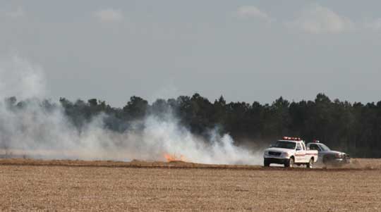 In the Pine Barren Road incident, the fire was partially in a heavily wooded area, and it required a bulldozer from the Florida Division of Forestry to reach it and plow a fire line around it. The fire was reported to be about five acres. One structure was threatened, but firefighters were able to quickly extinguish the fire around the building.