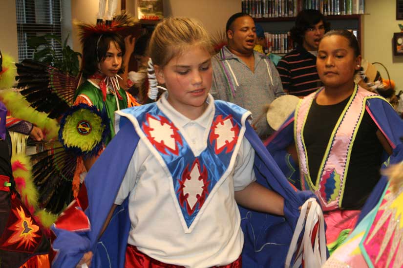 About 50 children enjoyed the performance at the libary. The children decorated pow wow drums and received necklaces before watching the 17 dancers perform traditional dances.