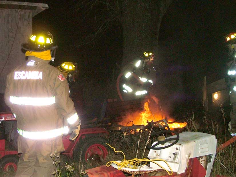 Pictured above and below: Firefighters work to extinguish the remains of a burning golf cart in Walnut Hill Monday night. NorthEscambia.com photos, click to enlarge.