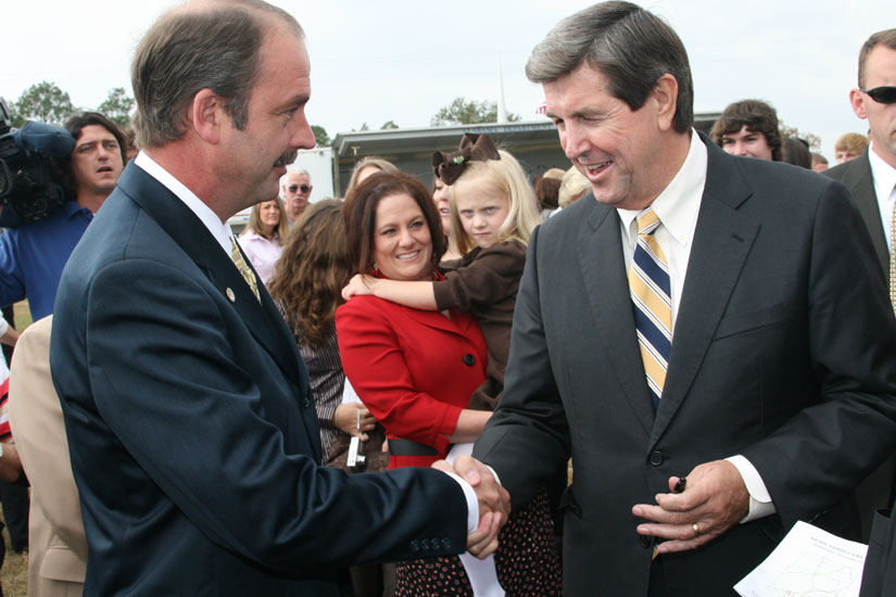 Pictured above: Dignitaries including Alabama Governor Bob Riley cut the ribbon on the newly widened Highway 113 in Flomaton Wednesday. Pictured below: Gov. Riley thanks Escambia County Commissioner Kevin White for Florida’s help on the project. NorthEscambia.com photos, click to enlarge.