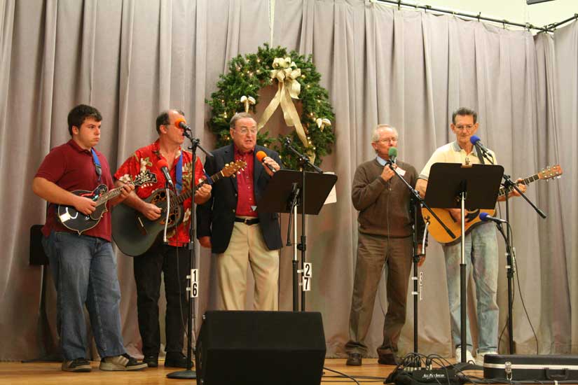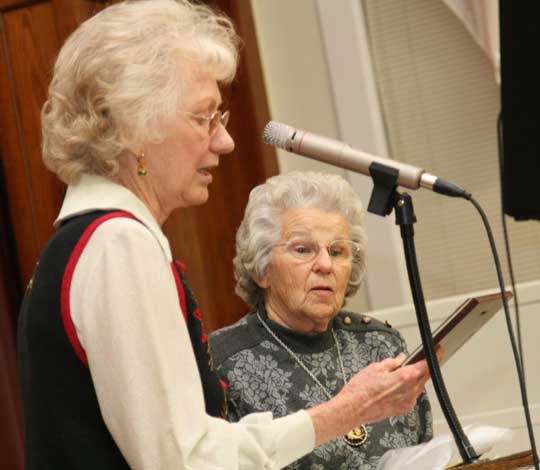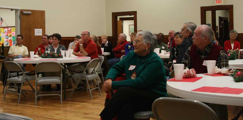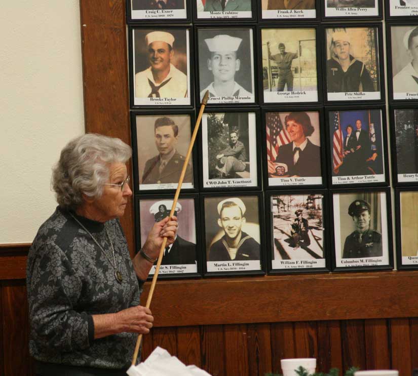 Pictured above: Nita Berry (left) presents the Barrineau Park Historical Society Member of the Year Award to Nancy Fillingim. Pictured inset: Fillingim points to photos on the Veterans Wall of Honor in the auditorium named for her late husband. Pictured below: The BPHS Christmas party included the performance of several Christmas favorites. Pictured bottom: The Barrineau Park Historical Society Christmas party Saturday night. NorthEscambia.com photos, click to enlarge.