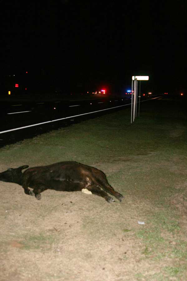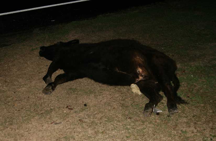 Pictured above and below: An Escambia County deputy and a prisoner he was transporting suffered minor injuries when the deputy’s cruiser struck this cow in front of Aldersgate Methodist Church in Molino Tuesday night. NorthEscambia.com photos, click to enlarge.
