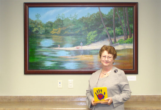 Pictured above: Autry Dye with her painting “Family Day on Blackwater River” at the Gulf Coast Kids House. Submitted photo for NorthEscambia.com.